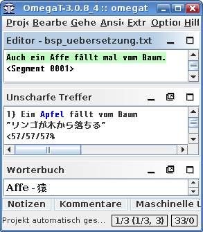 OmegaT teilt Text in Segmente auf und zeigt diese dem Übersetzer zur Bearbeitung an. Übersetzte Segmente werden in einer Translation Memory Datei gespeichert.